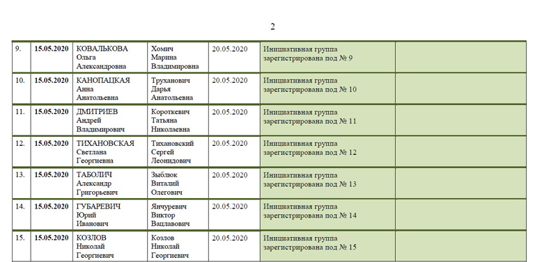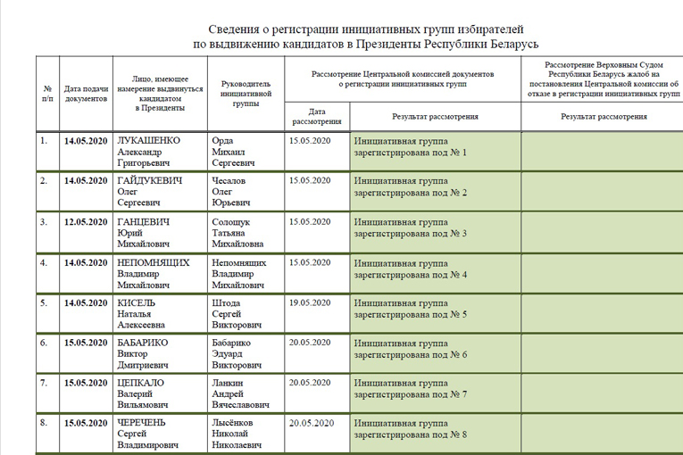 Зарегистрированы инициативные группы временно не работающего Виктора Бабарико, депутата Палаты представителей Олега Гайдукевича, фермера Юрия Ганцевича, индивидуального предпринимателя председателя ППОО «Движение «За Свободу» Юрия Губаревича, сопредседателя РИПОО «Говори правду» Андрея Дмитриева, индивидуального предпринимателя Анны Канопацкой, директора ЧТУП Натальи Кисель, главного бухгалтера ЖСПК №791 Ольги Ковальковой, исполняющего обязанности председателя Объединенной гражданской партии Николая Козлова, Президента Александра Лукашенко, пенсионера Владимира Непомнящих, мастера перманентного макияжа и татуировки Александра Таболича, временно не работающей Светланы Тихановской, индивидуального предпринимателя Валерия Цепкало, директора ООО «С58 Технолоджис» Сергея Черечня.
