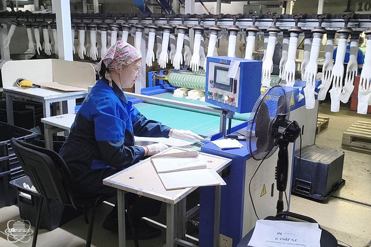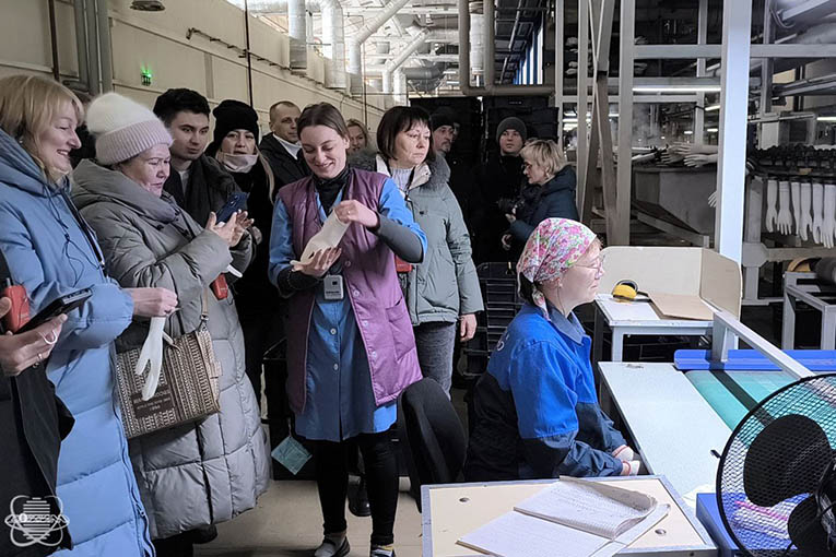 Следующим пунктом в экскурсионном маршруте был цех по производству медицинских перчаток. Экскурсоводом выступила инженер-технолог ЦПМП Яна Магляс. Гостям удалось лично увидеть процесс производства белорусских перчаток, посмотреть, как происходит их проверка и упаковка, выдалась возможность пообщаться с работниками цеха и оценить качество продукции под брендом СОХИМ.