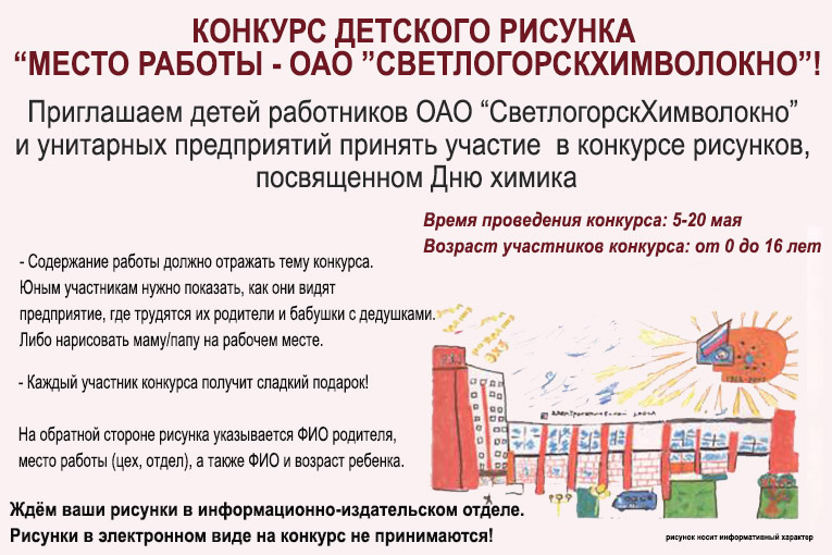 Конкурс детского рисунка «МЕСТО РАБОТЫ — ОАО «СВЕТЛОГОРСКХИМВОЛОКНО!»
